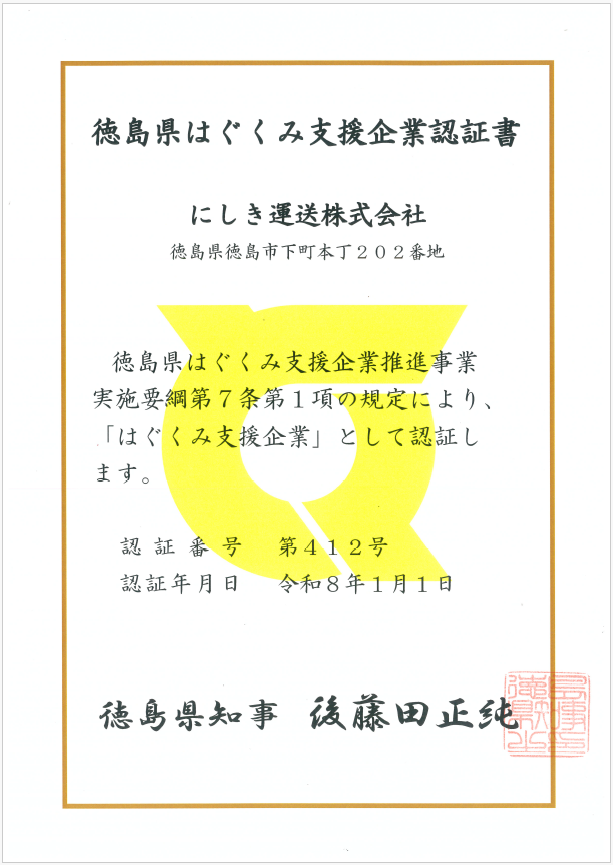 令和8年1月1日付けで徳島県より『はぐくみ支援企業』として認証していただきました。前回に引き続き3度目の認証でございます。